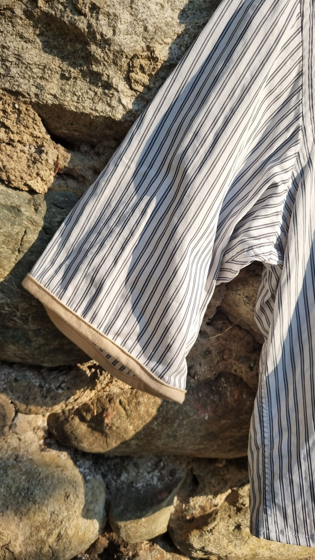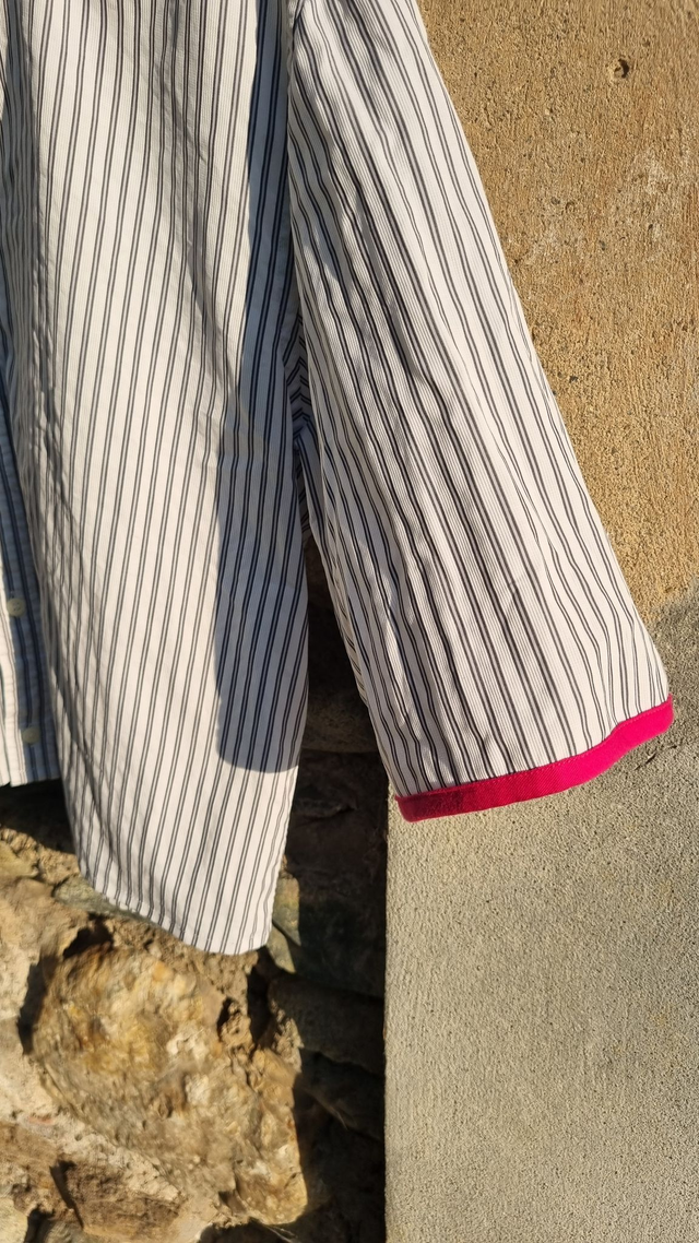 La particularité ? Les manches sont terminées par un biais coloré, et chaque chemise a ses propres couleurs. Pas deux pareilles, jamais (haha).