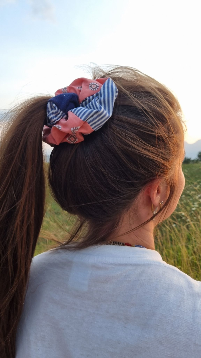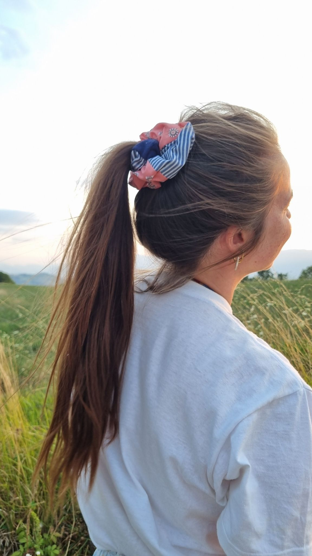 Chaque chouchou est unique et confectionné à partir des chutes de tissu issues de la création des chemises upcyclées : rien ne se perd, tout se transforme.