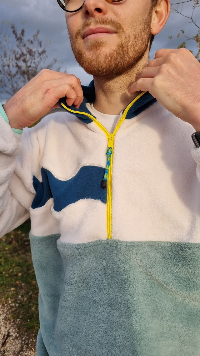 Ce polaire est confectionné à partir de tissus de stocks dormants (fin de rouleaux) et/ou de tissus chinés.